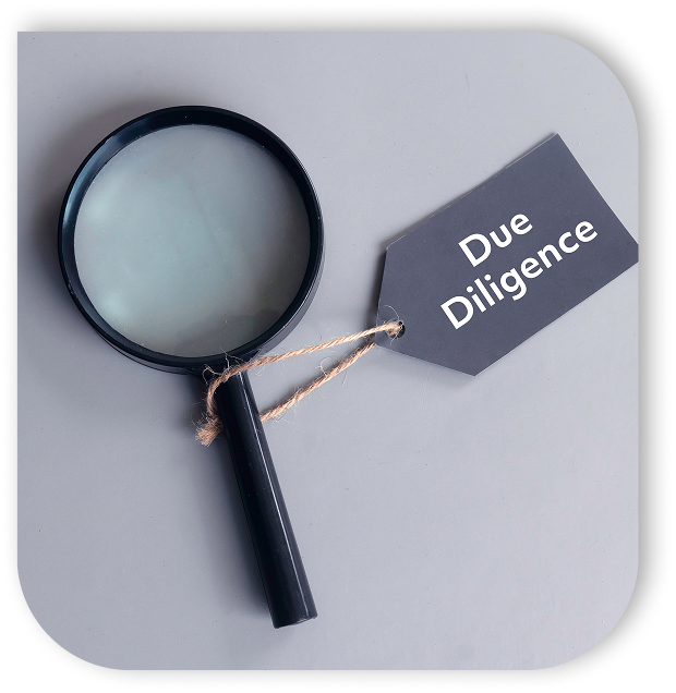 Due diligence includes reviewing legal documents, financial records, contracts, and business operations.